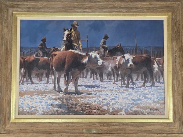 His oil paintings are celebrated for their dramatic lighting, vibrant colors, and authenticity, capturing the mood of fleeting moments with a representational style that avoids strict realism. Notable works include The Vigilance Committee (1999), Who’s Robbin’ This Train Enyway? (1986), Fired Upon (1990), and Curious Treasures (2019), often featuring cowboys, Native American figures, and historical scenes like stagecoaches or the Pony Express. His auction prices range from $605 to $41,400, with The Maelstrom (2012) fetching the highest at Jackson Hole Art Auction.